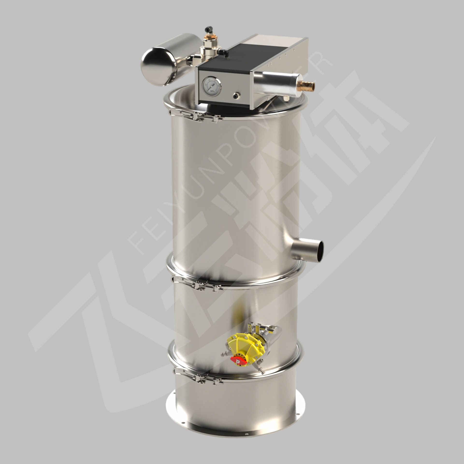 当压缩空气供给真空发生器时,真空发生器就产生负压形成真空气流,物料被吸入吸料咀,形成物气流,经过吸料管到达上料机的料仓内。过滤器把物料与空气彻底分离,当物料装满料仓时,控制器会自动切断气源,真空发生器停止工作,同时料仓门自动开启,物料落到设备的料斗中。与此同时,压缩空气通过脉冲反吹阀自动清洗过滤器。等到时间到或料位传感器发出上料信号时,自动启动上料机。